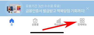 우리WON뱅킹 실행 후 아래와 같이 하단의 메뉴에서 전체메뉴를 눌러주세요. 만약 아래와 같이 배너가 나온다면 배너를 눌러주셔도 됩니다. 배너가 안나온다면 전체메뉴를 눌러주세요. 그리고 로그인이 되어 있어야 메뉴가 보입니다.