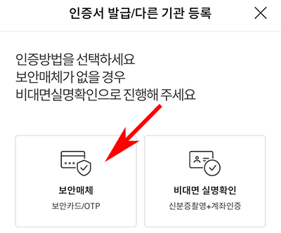 그리고 이제 전체동의를 눌러주시면 다시 화면이 이동됩니다. 인증방법을 선택하라는 화면이 나오는데, 여기에서 보안매체가 있다면 보안매체를 선택하고 없다면 비대명 실명확인을 하시면 됩니다. 저는 보안매체가 있어서 간편하게 인증하였습니다.